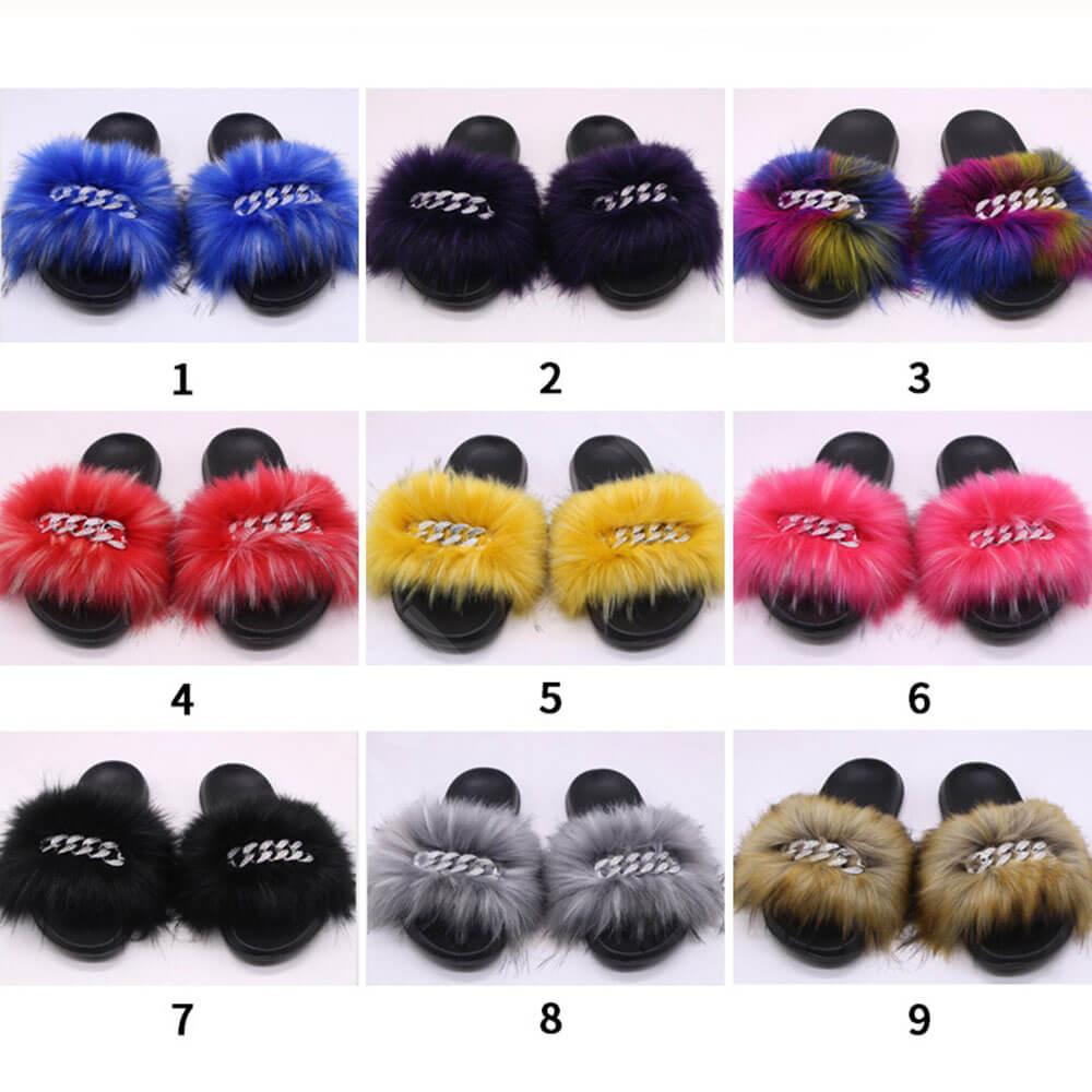 Fashion Fur Slides Faux Raccoon Fur Slippers with Rhinestone Decoration Wholesale