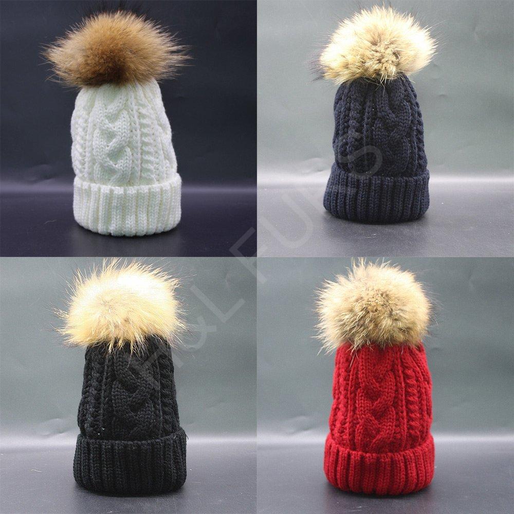 Polyester Knitted Toboggan Hat With Natural Raccoon Pompom