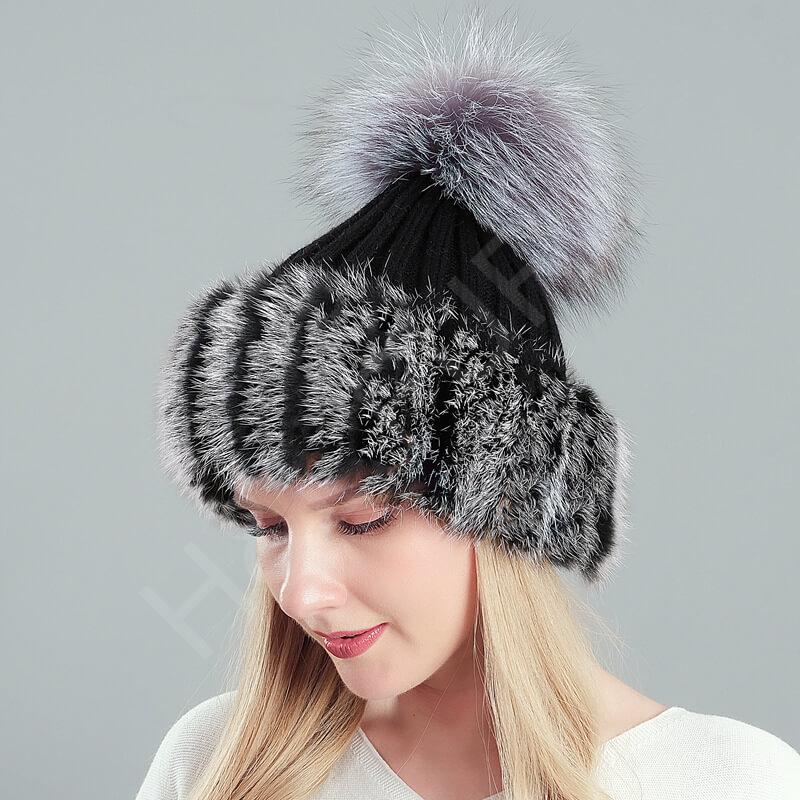 Polyester Knitted Hat with Rex Rabbit Fur and Silver Fox Pompom Professional Supplier.
