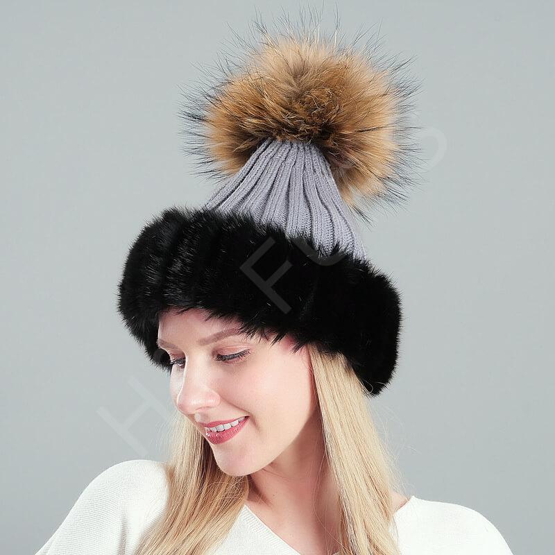 Polyester Knitted Hat with Rex Rabbit Fur and Natural Raccoon Pompom Wholesale