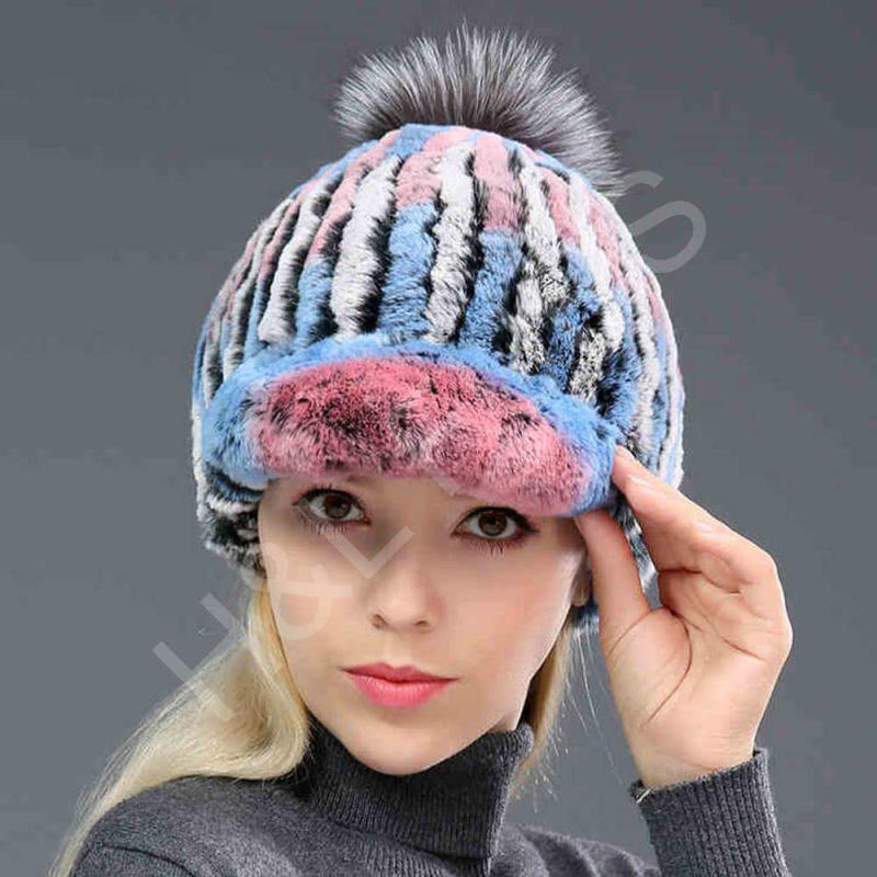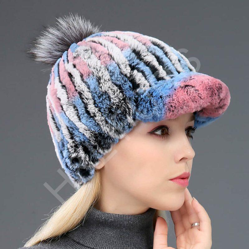 Striped Rex Rabbit Fur Hat with Fox Pompom